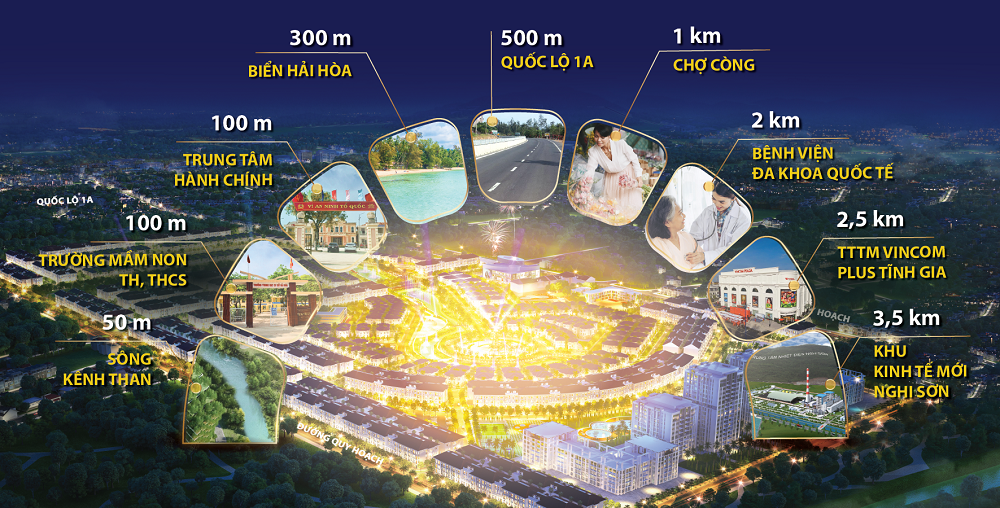 Bên cạnh đó từ dự án, cư dân cũng có thể tiếp cận được hệ thống tiện ích ngoại khu lân cận trong vùng như: Cách sông Kênh Than 50 m; cách hệ thống trường mầm non, TH, THCS 100 m; cách UBND xã Hải Hòa 100 m; cách bãi biển Hải Hòa 300 m; cách tuyến Quốc lộ 1A 500 m; cách chợ Còng 1 km; cách Bệnh viện đa khoa khu vực Nghi Sơn 2 km; cách hệ thống TTTM Vincom 2,5 km; cách Khu kinh tế Nghi Sơn 3,5 km…